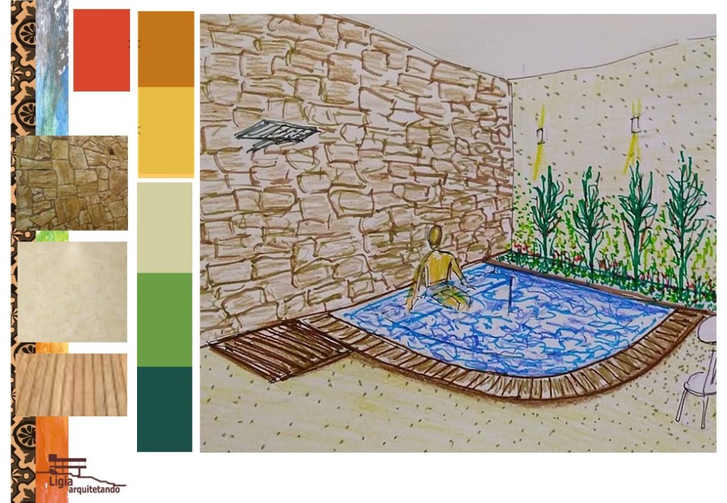 Uma simplicidade com certo requinte. A piscina com degrau tipo banco para sentar e se refrescar nos dias de calor. A água também pode ser aquecida, com pontos de hidromassagem, filtro com ozonio, luminarias especificas para ficarem submersas, entre outros itens e esses são iténs de investimentos maiiores. Tudo vai conforme o bolso. Muitas coisas são possiveis. Alguns itens são ajustados no decorrer do projeto.